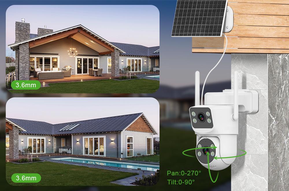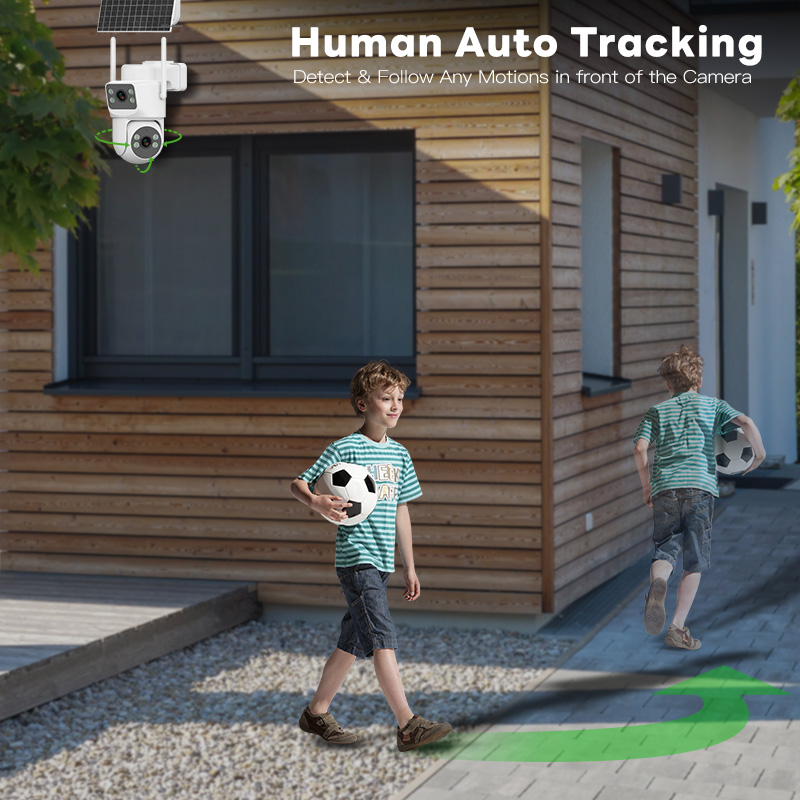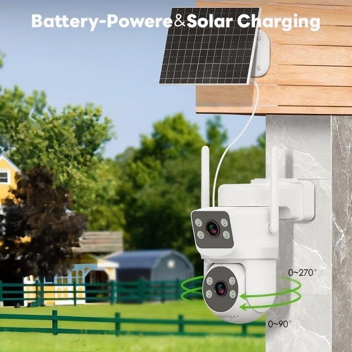 Dual-lens dual-screen design, Full-color night vision, AI humanoid detection and Auto Tracking, IP66 waterproof, solar-powered & wire-free. AOV 24/7 Hous recording,work in any off-grid without Wifi and Power
